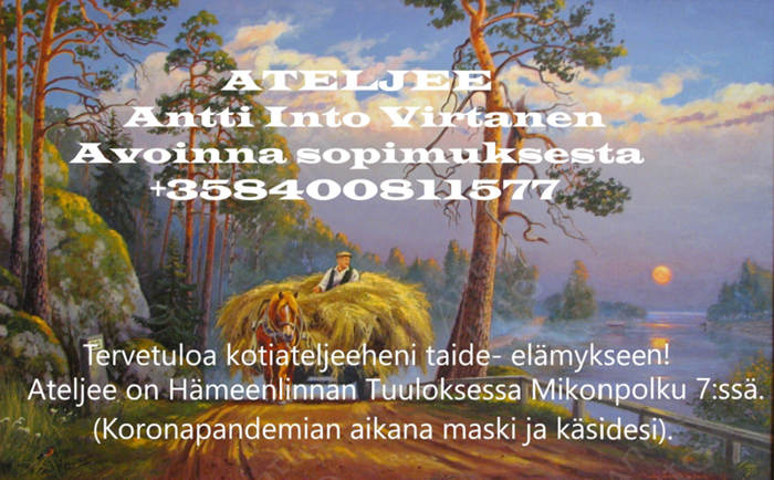 Antti Into Virtanen, professional artist since 1980. As a passionate and devoted artist has had no secondary income over 40 years, and has supported himself and his family exclusively by his artwork. Themes Illustrations and objects of paintings vary, including seasonal landscapes, landscapes at every hour of the day with different lighting, as well as portraits, including recent Finnish president couple. Majority of the paintings are executed with realism; however, repertoire includes nativistic and modern art. Highlights · Oil paintings of landscapes in Finnish countryside- across all four seasons; winter, spring, summer and autumn. · Captured current and disappearing landscape culture, e.g. historic Rapola fortness (Sääksmäki), as well private residencies, family homes, meadows, beaches, pets, and many more themes that have been significant for the individual commissioning the art. · Recorded accurately nature’s shapes and multiverse in different lighting, e.g. flora, animals, water and luminaries in different formats and elements. · Eurasian bullfinch is the signature creature in every painting. Humoristic ideas and good mood pictures bring out the humoristic side of the artist.Great awe and respect for uniqueness of Finnish landscape and nature is evident in Antti Into Virtanen’s art, as well as descripting the balance and symbiose of human and nature. His art aims to please the eye, while supporting the values of preserving nature. Since spring working has been very challenging due to an eye disease, impacting the vision. The left eye was diagnosed with Chorioretinopathia cetralis serosa. Antti has been still continued to work, although with more challenges and slower pace. Memberships: Valkeakosken kuvataiteilijat ry, Kuvasto ry. Education: Self tought artist Painting technique: Mainly with oil, building on layers. Continuous exhibition: · Home gallery (open upon agreement). · Starting May 6th 2008; two glass showcases on the main promenade of Shopping mall Tuulonen